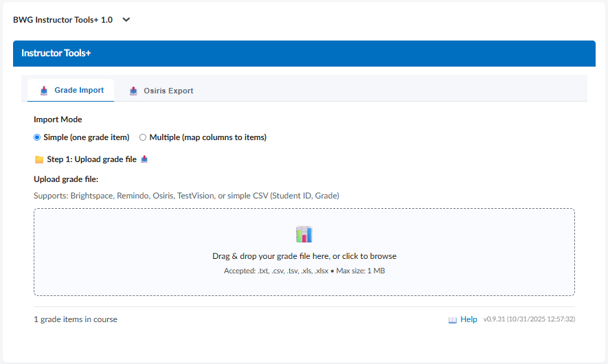 - Grade Import: importing various file types into the gradebook with built-in checks and previews (see manual).