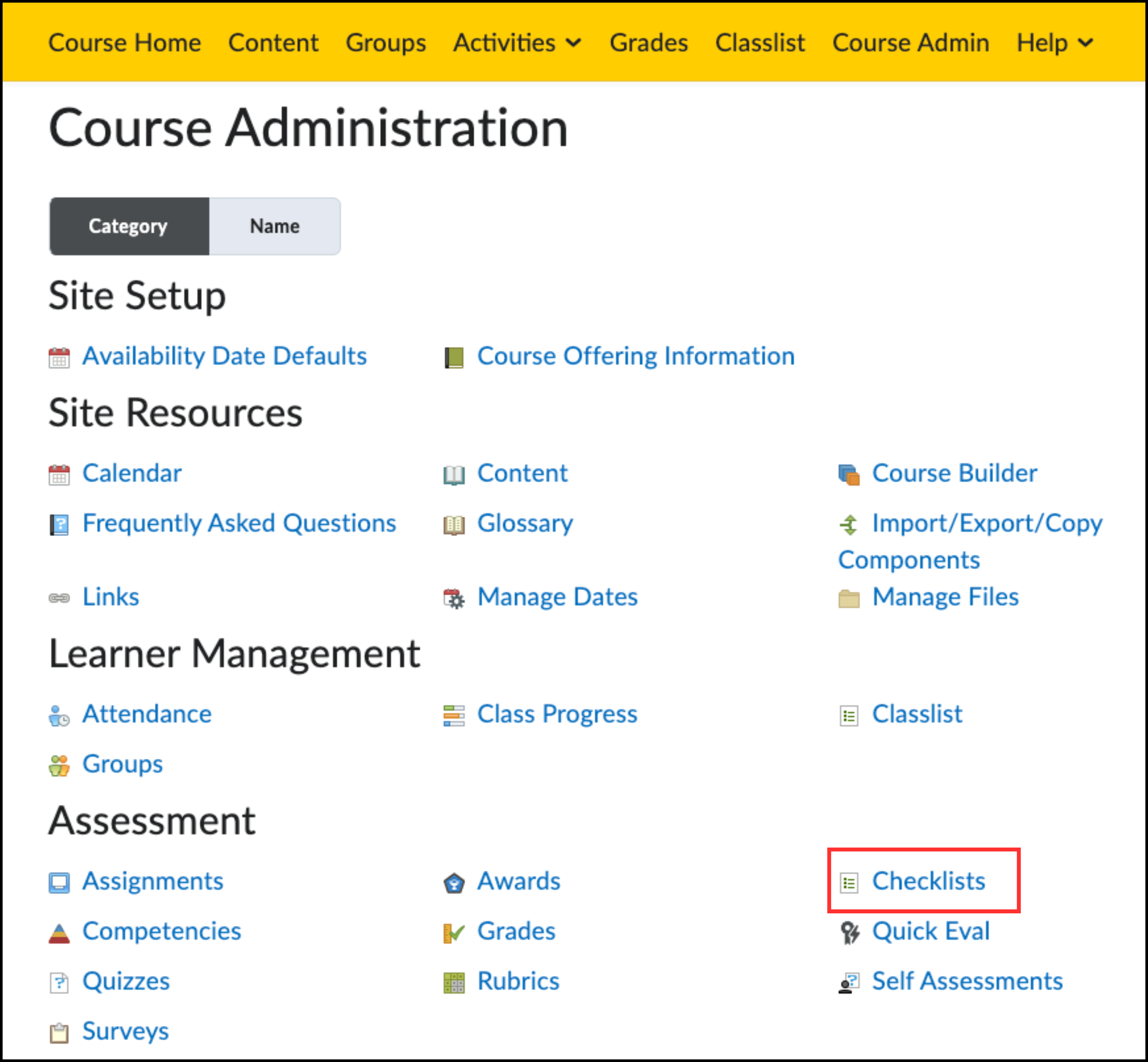 - Go to Checklists by navigating whithin the course to ‘Course Admin’ -> ‘Checklists’.