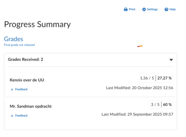 | Objectives | Koppeling van leerdoelen aan opdrachten, overzicht voortgang per doel | Uit | Wordt bij UU niet gebruikt, functionaliteit is niet ingericht |